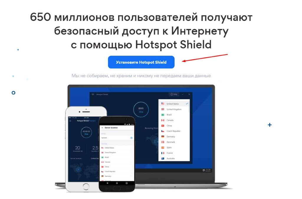 Для того, чтобы скачать установочный файл Hotspot Shield на Windows, перейдите на официальный сайт проекта и найдите соответствующую кнопку: