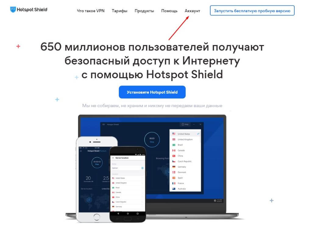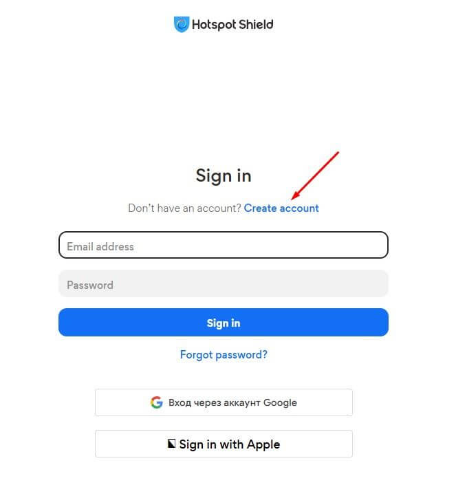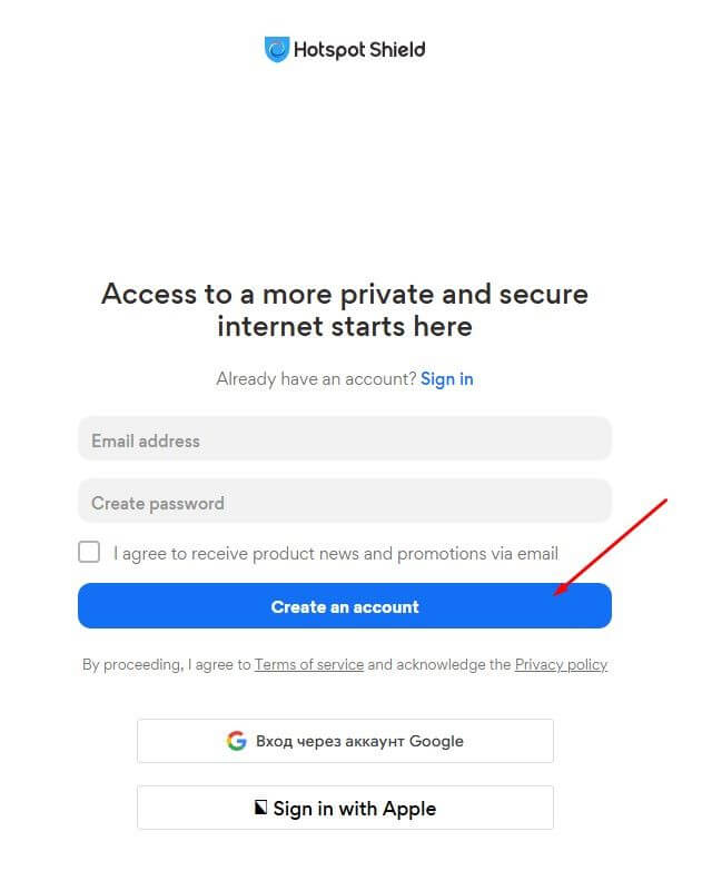Чтобы воспользоваться функционалом Hotspot Shield, пользователю потребуется создать учетную запись. Для регистрации аккаунта на официальном сайте нажмите на соответствующую кнопку: